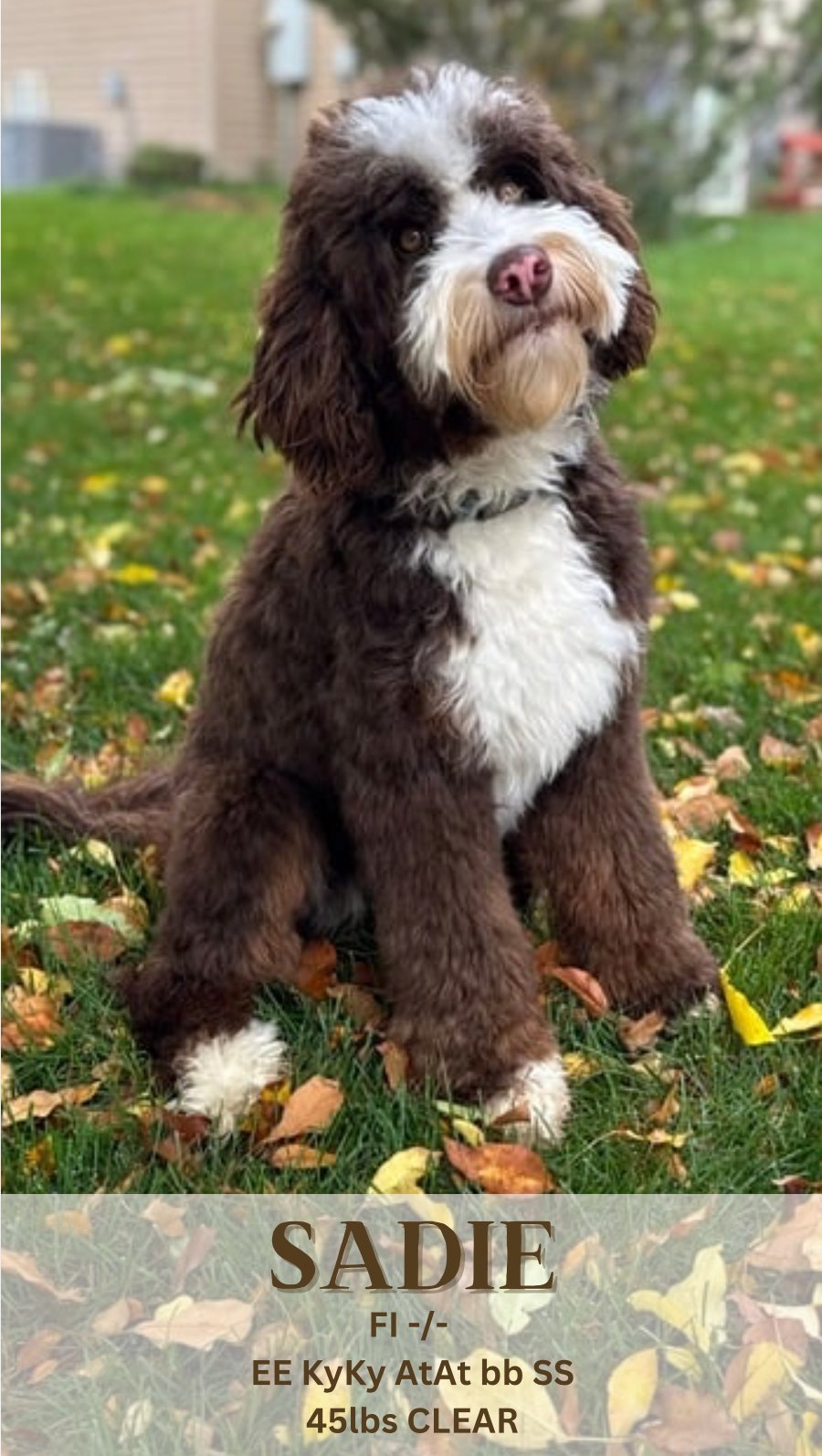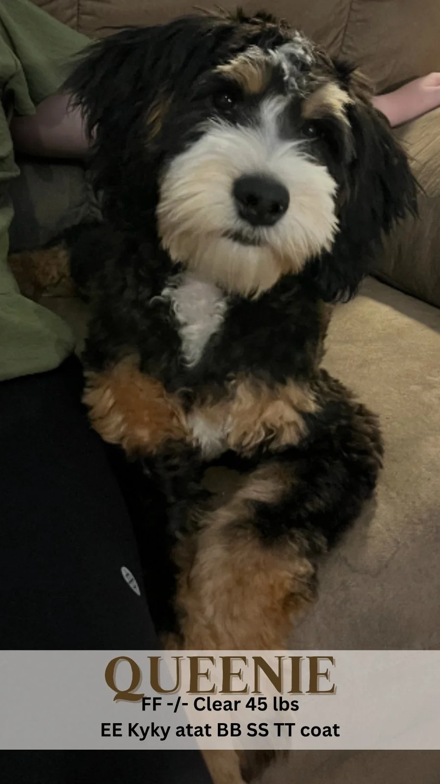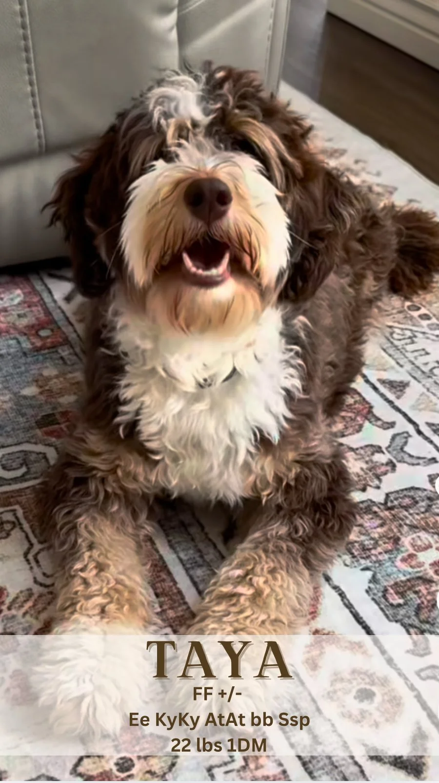 Taya is our multigen mini Bernedoodle. She weighs 23 lbs and is around 18” tall. She has the happiest little trot a happy dog could have. She is a lover and is happiest when with her family cuddled up on the couch. She has been tested through Animal Genetics!